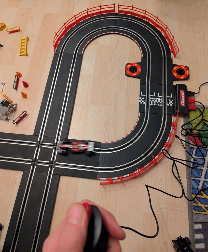 Nach dem das Arbeitsheft des Calliope durchgearbeitet war und damit die erste Entdeckung abgeschlossen, haben wir uns daran gemacht den Calliope mini ins Kinderzimmer zu integrieren. Niklas erste Idee war ein „Bitte Folgen“ für das Playmobil-Polizeiauto. Also haben wir eine Warntafel für das Polzeiauto programmiert. Mit verschiedenen Licht- und Tonsignalen auf Knöpfen und PINs. So fährt er jetzt regelmäßig durch die Playmobil und Lego-Welt im Kinderzimmer.